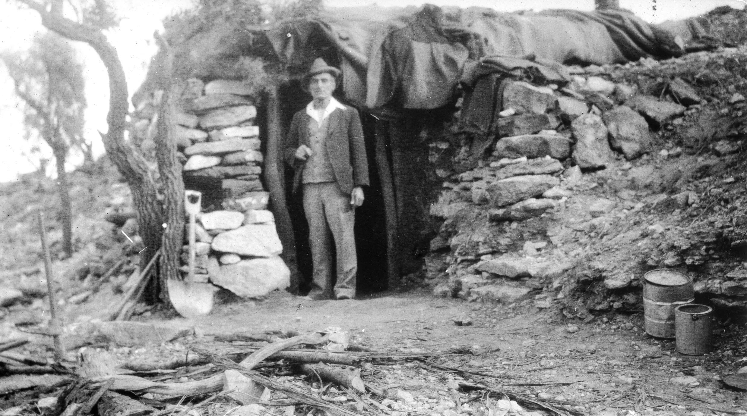 Ernie Sherman outside his dugout on Opal Creek in 1932. (Sherman Archives)